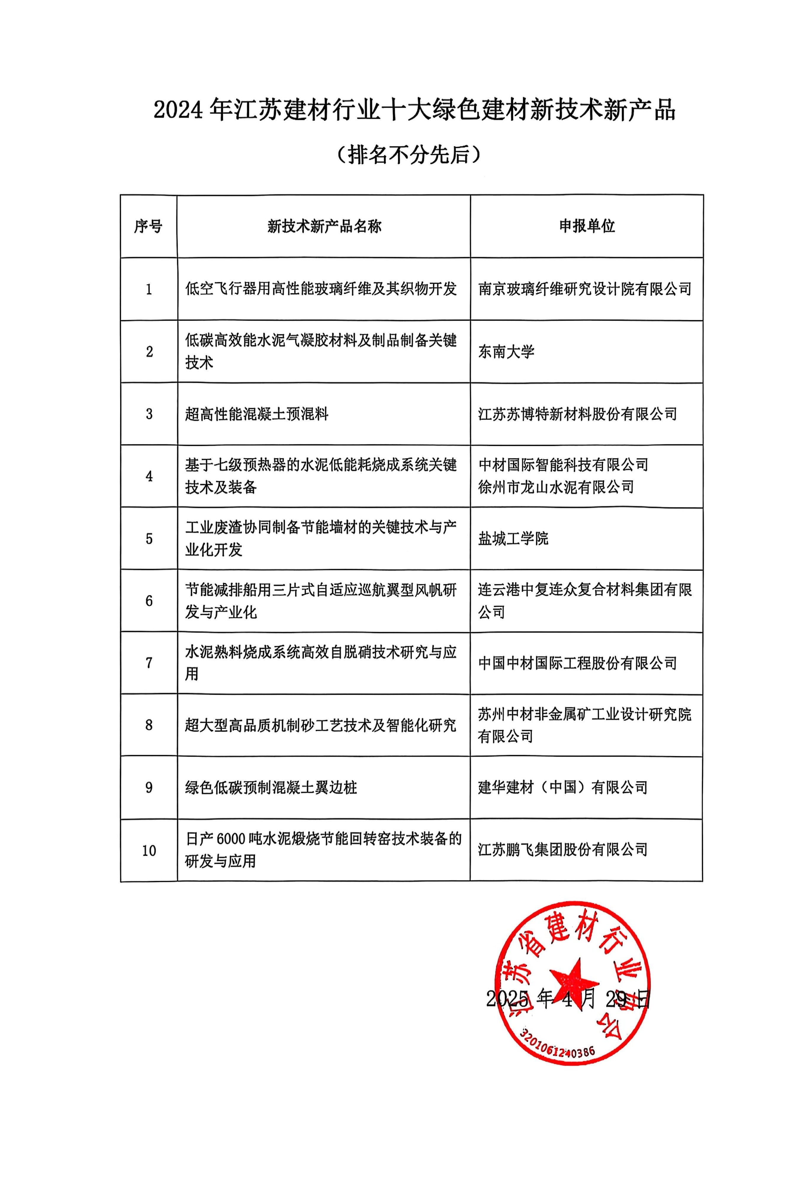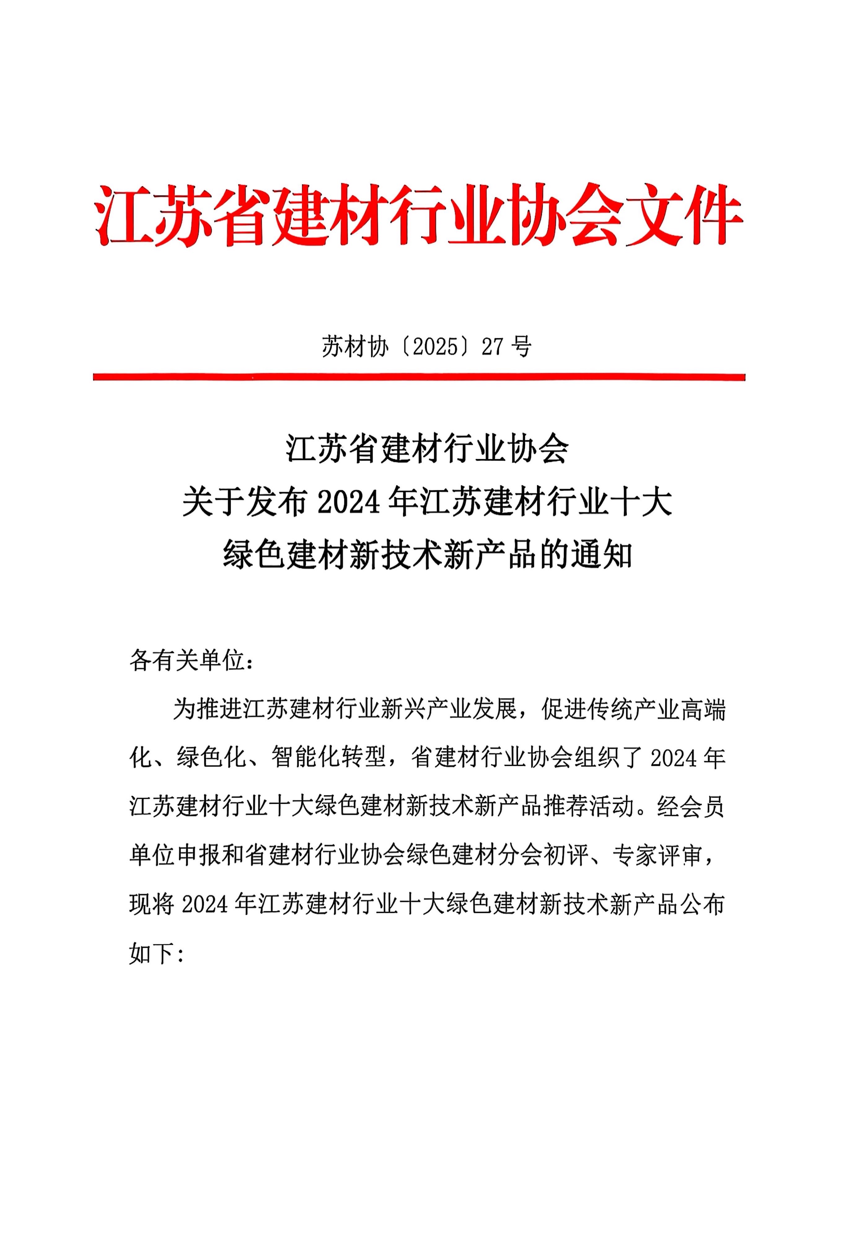 关于发布2024年江苏建材行业十大绿色建材新技术新产品的通知