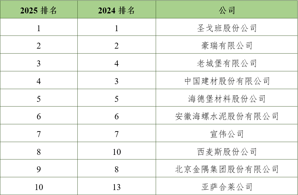 圣戈班股份公司(法国)连续三年位居综合实力第一名,营运利润率和现金流创造新纪录,并通过收购业务,不断扩大在化学建材领域的份额;豪瑞有限公司(瑞士)稳居第二名,流动资产略有下降,其余指标均有不同程度的增长;老城堡有限公司(爱尔兰)营业利润继续保持增长态势,排在第三名;中国建材股份有限公司营业收入和营业利润降低,排在第四名; 海德堡材料股份公司(德国)营业利润小幅下降,其余指标略有增长,排在第五名。亚萨合莱公司(瑞典)营业收入和利润率均达到了两位数的增长,首次跻身前十。