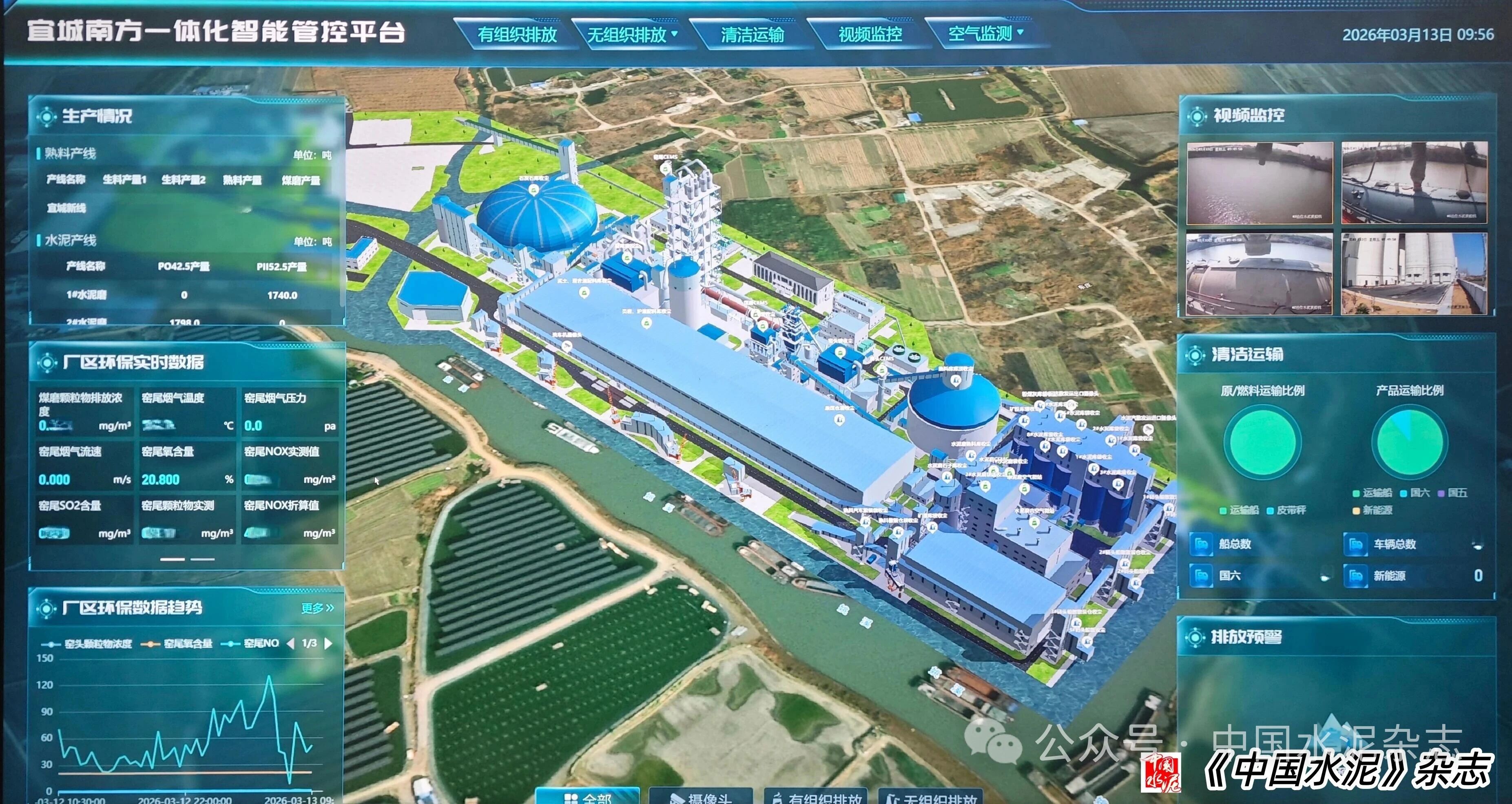 在产线优化的基础上,宜城南方大力推动环境管控体系的数智化升级。企业构建的环境智能一体化管控平台,集成五大功能模块,推动环保管理从“人工巡检”向“智能预警”跨越:CEMS系统智能管控模块实时监测窑头、窑尾、煤磨、水泥磨等主排放口数据;无组织排放智能管控模块动态追踪抑尘设备运行状况;清洁运输智能管控模块实时监控清洁运输总量与占比,并与交通部门智能联动;道路清洁管理模块自动冲洗出厂车辆;空气微站系统实时监控厂区颗粒物浓度,异常情况及时报警处置。五大模块协同发力,推动环境管理向高端化、精细化、智能化跃升。