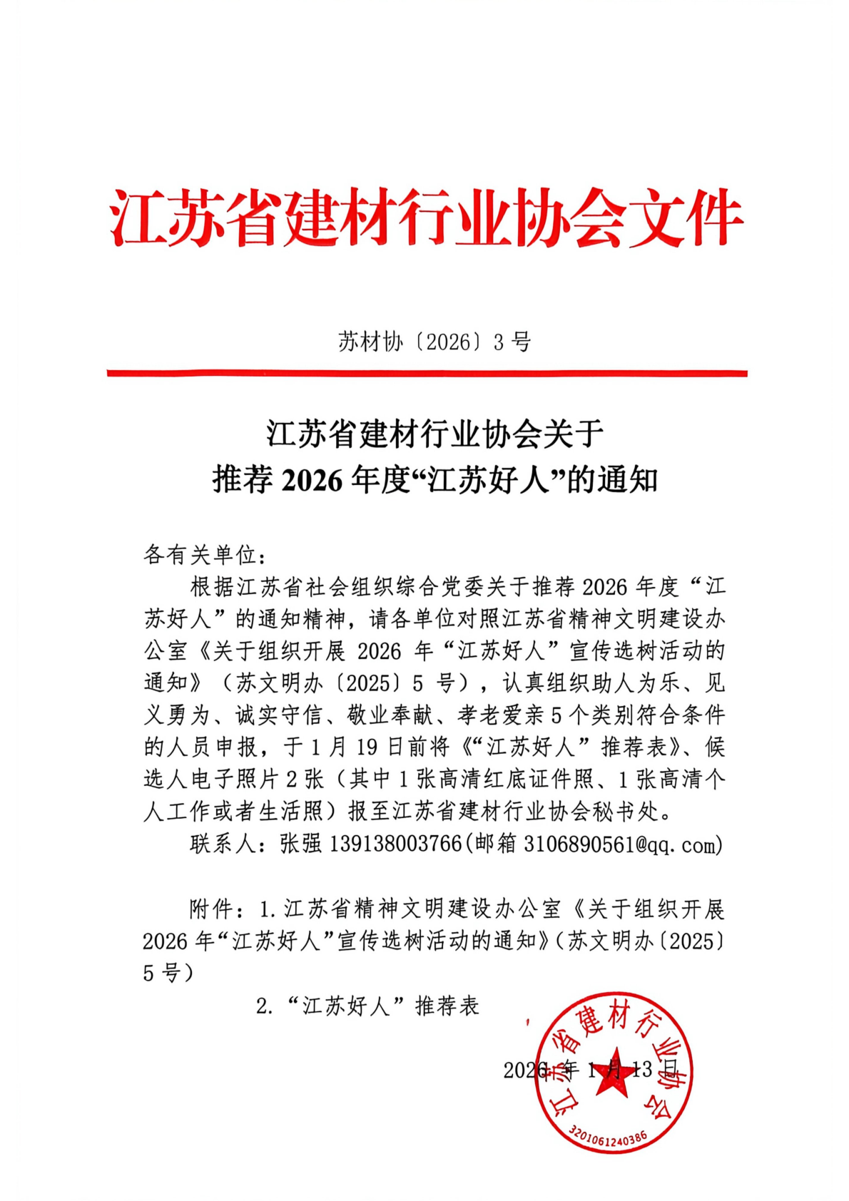 江苏省建材行业协会关于推荐2026年度“江苏好人”的通知